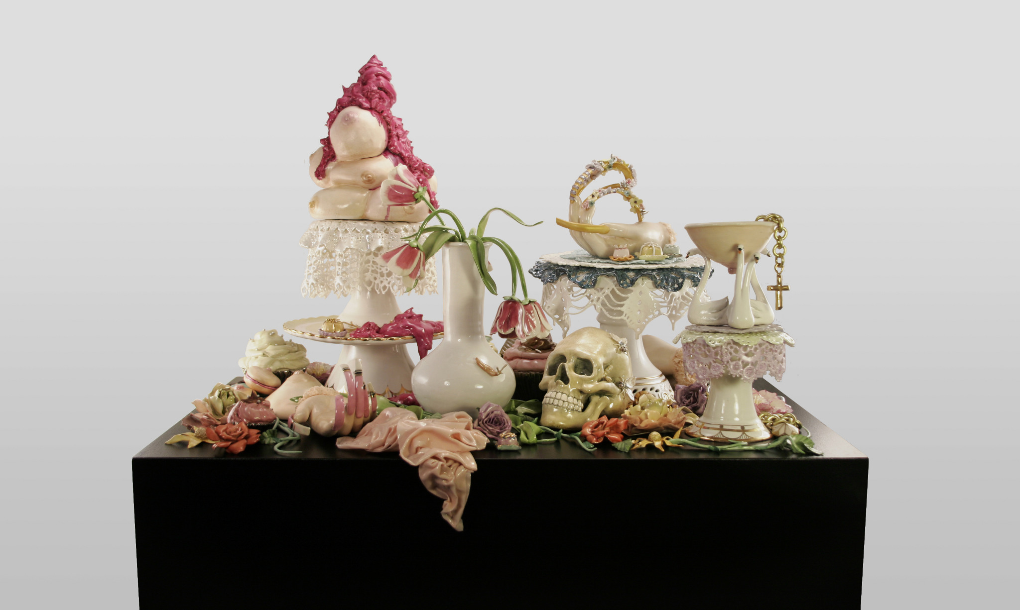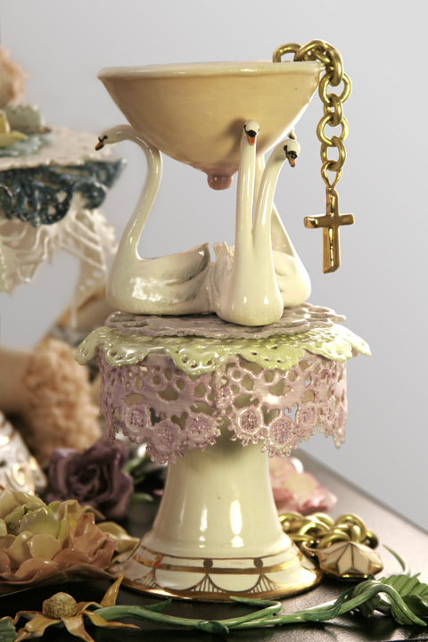 2012, porcelain, glaze, china paint, lustre, mixed- media, 27 x 27 x 17 ins.